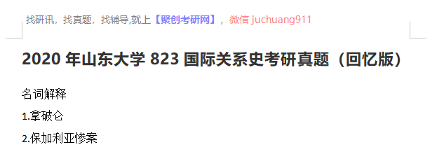 以上是聚创考研网为考生整理的"2020年山东大学823国际关系史考研真题(回忆版)"的相关考研信息,希望对大家考研备考有所帮助! 备考过程中如有疑问,也可以添加老师微信juchuang911进行咨询。