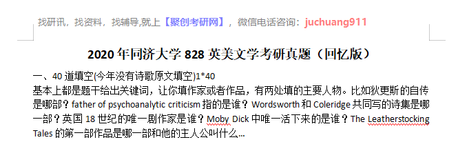 以上是聚创考研网为考生整理的"2020年同济大学828英美文学考研真题(回忆版)"的相关考研信息,希望对大家考研备考有所帮助! 备考过程中如有疑问,也可以添加老师微信juchuang911进行咨询。