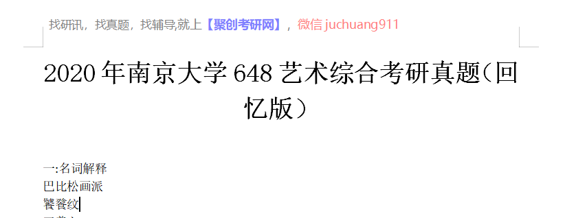 以上是聚创考研网为考生整理的"2020年南京大学648艺术综合考研真题(回忆版)"的相关考研信息,希望对大家考研备考有所帮助! 备考过程中如有疑问,也可以添加老师微信juchuang911进行咨询。