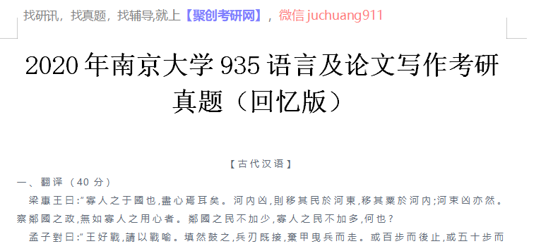 以上是聚创考研网为考生整理的"2020年南京大学935语言及论文写作考研真题(回忆版)"的相关考研信息,希望对大家考研备考有所帮助! 备考过程中如有疑问,也可以添加老师微信juchuang911进行咨询。