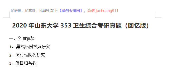 以上是聚创考研网为考生整理的"2020年山东大学353卫生综合考研真题(回忆版)"的相关考研信息,希望对大家考研备考有所帮助! 备考过程中如有疑问,也可以添加老师微信juchuang911进行咨询。
