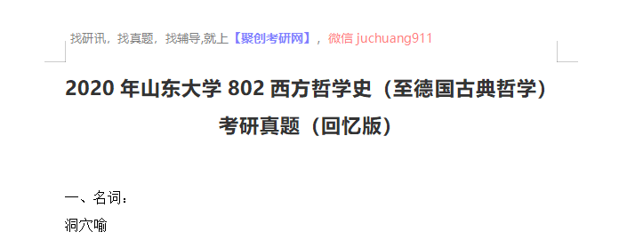 以上是聚创考研网为考生整理的"2020年山东大学802西方哲学史(至德国古典哲学)考研真题(回忆版)"的相关考研信息,希望对大家考研备考有所帮助! 备考过程中如有疑问,也可以添加老师微信juchuang911进行咨询。