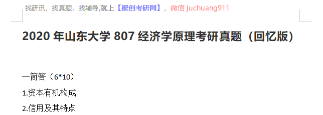 以上是聚创考研网为考生整理的"2020年山东大学807经济学原理考研真题(回忆版)"的相关考研信息,希望对大家考研备考有所帮助! 备考过程中如有疑问,也可以添加老师微信juchuang911进行咨询。