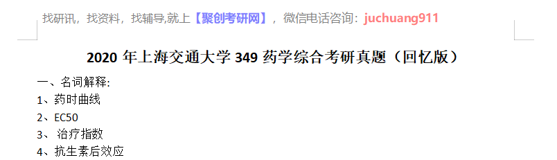 以上是聚创考研网为考生整理的"2020年上海交通大学349药学综合考研真题(回忆版)"的相关考研信息,希望对大家考研备考有所帮助! 备考过程中如有疑问,也可以添加老师微信juchuang911进行咨询。