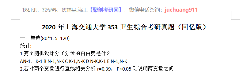 以上是聚创考研网为考生整理的"2020年上海交通大学353卫生综合考研真题(回忆版)"的相关考研信息,希望对大家考研备考有所帮助! 备考过程中如有疑问,也可以添加老师微信juchuang911进行咨询。