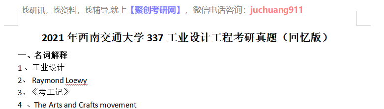 以上是聚创考研网为考生整理的"2021年西南交通大学337工业设计工程考研真题(回忆版)"的相关考研信息,希望对大家考研备考有所帮助! 备考过程中如有疑问,也可以添加老师微信juchuang911进行咨询。