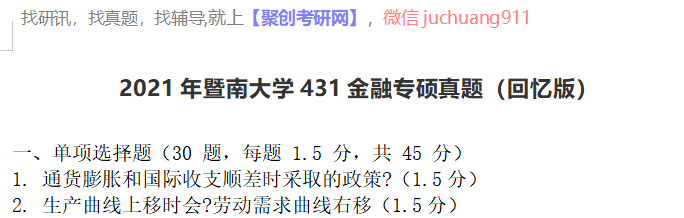 以上是聚创考研网为考生整理的"2021年暨南大学431金融专硕真题(回忆版)"的相关考研信息,希望对大家考研备考有所帮助! 备考过程中如有疑问,也可以添加老师微信juchuang911进行咨询。