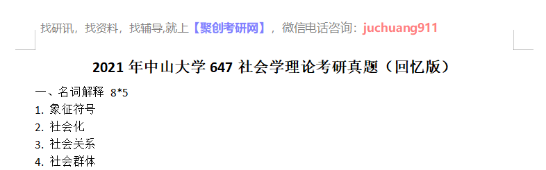 以上是聚创考研网为考生整理的"2021年中山大学647社会学理论考研真题(回忆版)"的相关考研信息,希望对大家考研备考有所帮助! 备考过程中如有疑问,也可以添加老师微信juchuang911进行咨询。