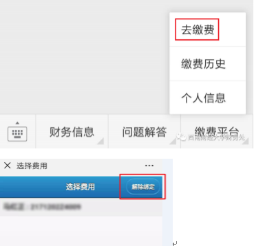 在界面下方的菜单中选择“缴费平台”-“去缴费”。若未显示登陆界面,需点击界面右上角“解除绑定”重新登录。