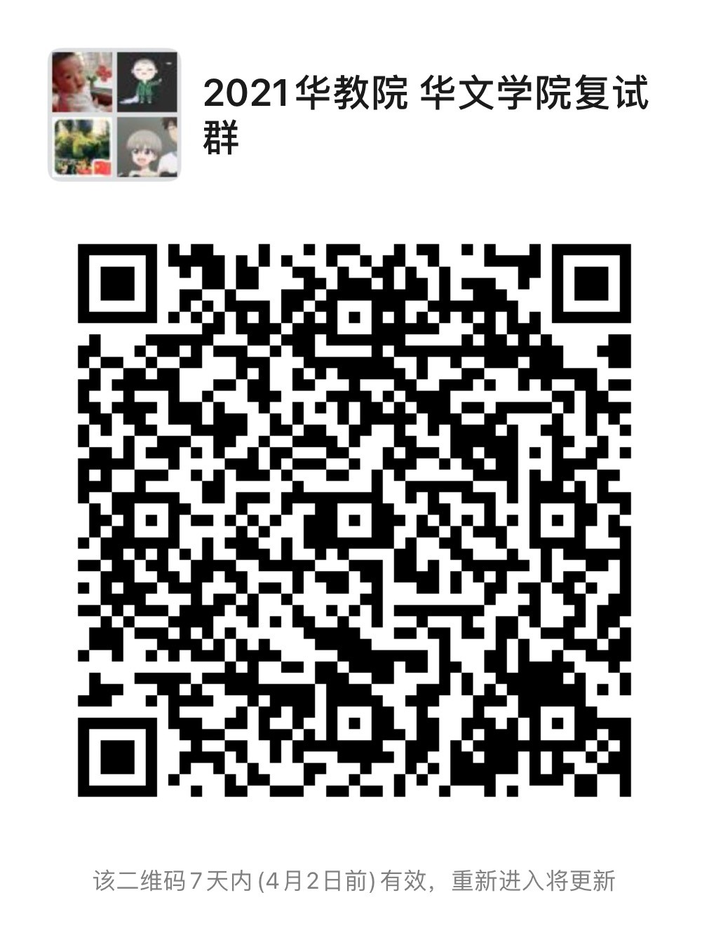 2.请复试名单上所有考生扫描下图二维码,加入2021年华文学院、华文教育研究院复试微信群,以便及时收到后续复试通知。进群后请立即修改昵称为“专业名称-姓名”。