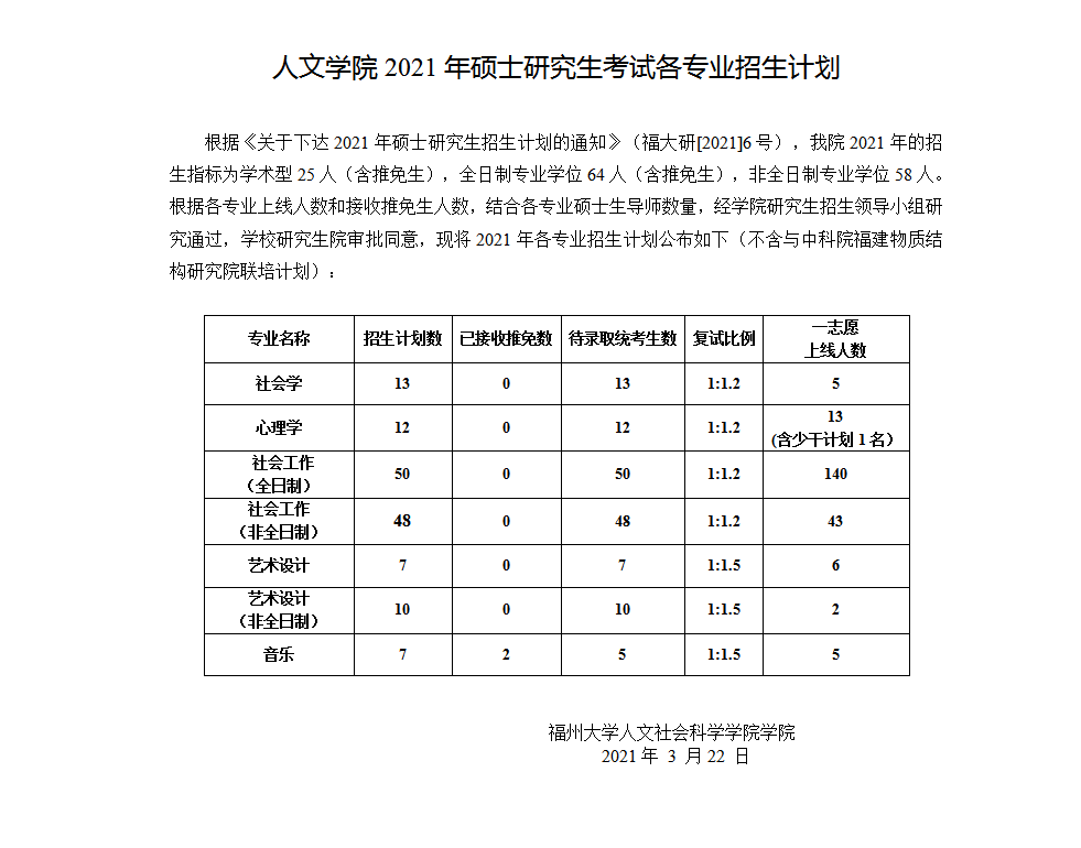据悉,福州大学人文学院2021年硕士研究生考试各专业招生计划已公布,聚创福州大学考研网汇总信息如下: