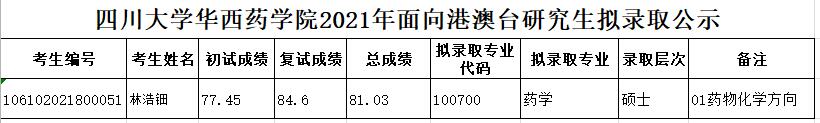 据悉,四川大学华西药学院2021年面向港澳台研究生拟录取公示已公布,聚创四川大学考研网小编为大家整理如下: