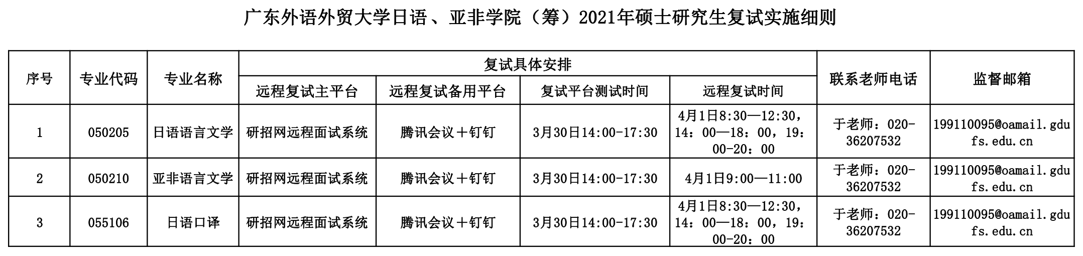 以上是聚创考研网为考生整理的"广东外语外贸大学日语、亚非学院(筹)2021年硕士研究生复试实施细则"的相关考研信息,希望对大家考研备考有所帮助! 备考过程中如有疑问,也可以添加老师微信juchuang911进行咨询。