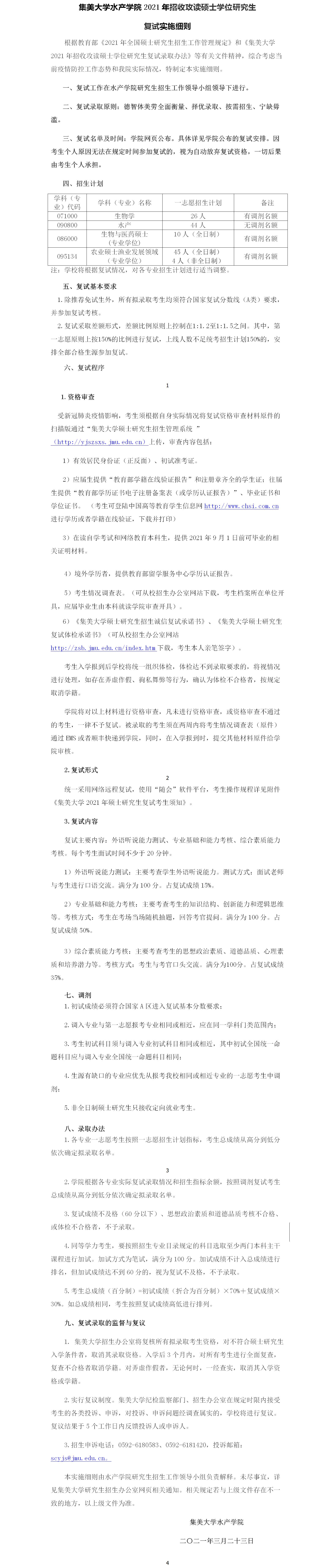 以上是聚创考研网为考生整理的"集美大学水产学院2021年招收攻读硕士学位研究生复试实施细则"的相关考研信息,希望对大家考研备考有所帮助!
