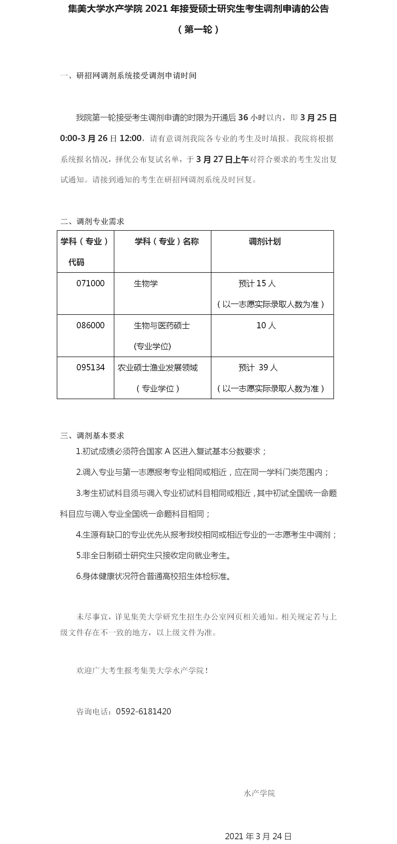 以上是聚创考研网为考生整理的"集美大学水产学院2021年接受硕士研究生考生调剂申请的公告(第一轮)"的相关考研信息,希望对大家考研备考有所帮助!
