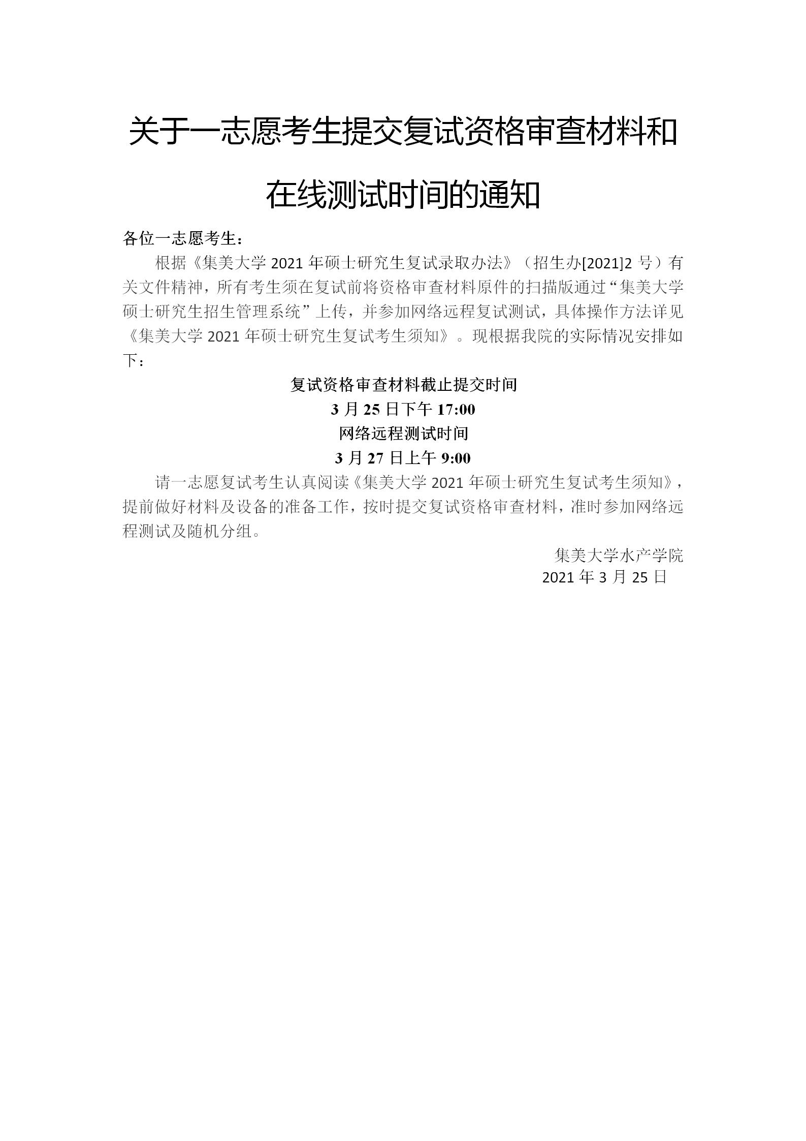 以上是聚创考研网为考生整理的"集美大学水产学院关于一志愿考生提交复试资格审查材料和在线测试时间的通知"的相关考研信息,希望对大家考研备考有所帮助!