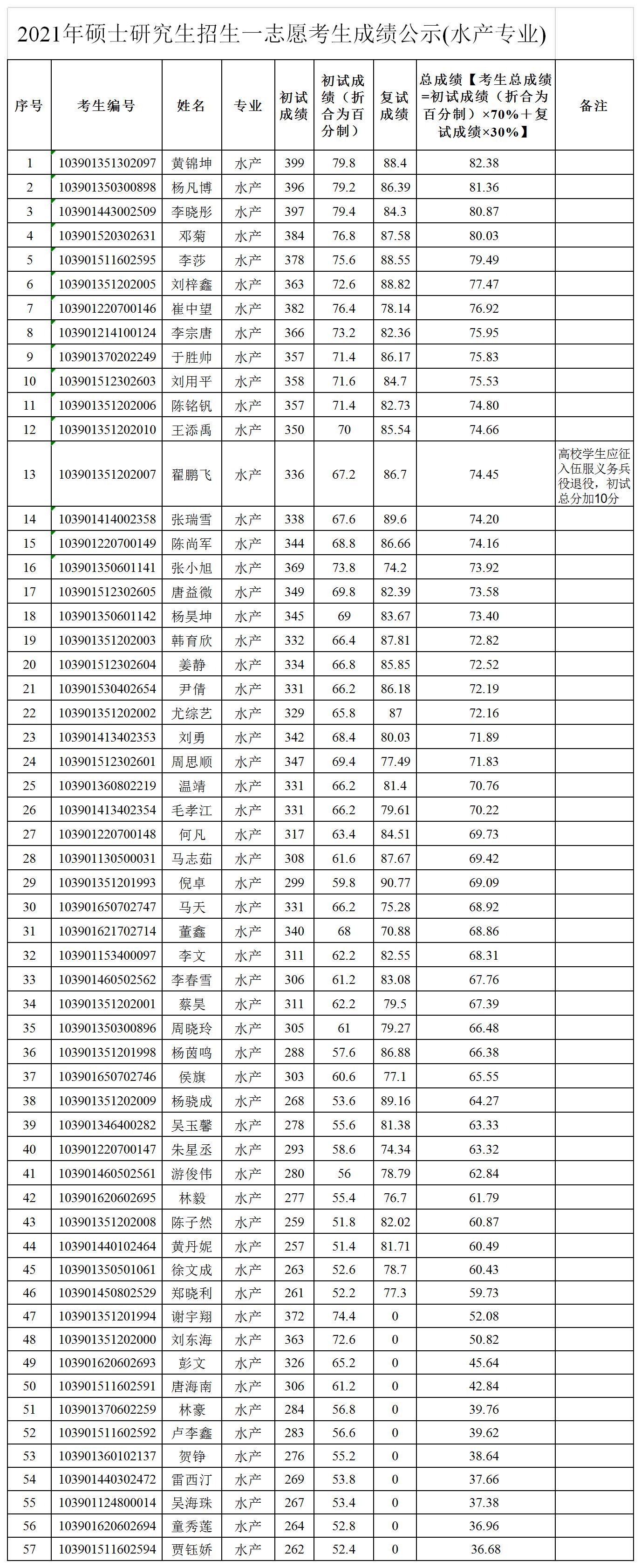 据悉,集美大学2021年硕士研究生招生一志愿考生成绩公示(水产专业)已公布,聚创集美大学考研小编为你整理如下内容: