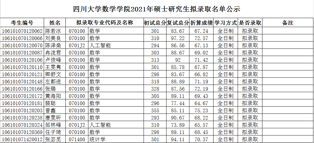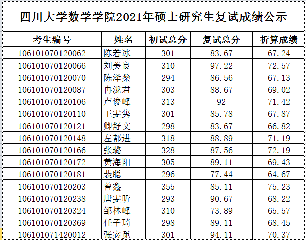 据悉,四川大学数学学院2021年硕士研究生复试成绩及拟录取名单公示已公布,聚创四川大学考研网小编为大家整理如下: