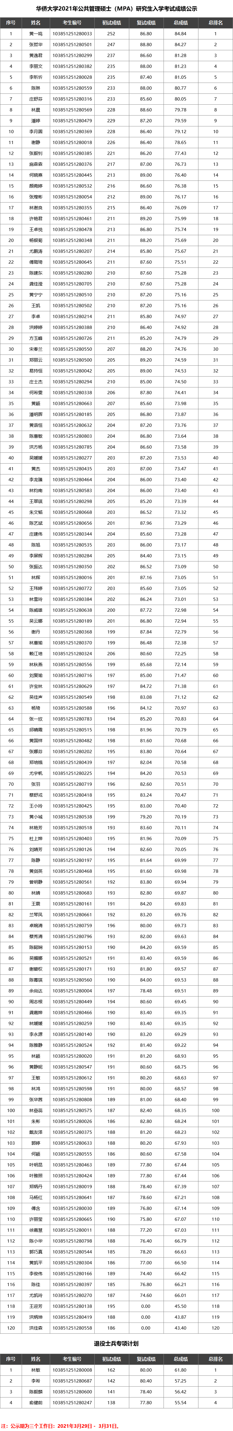 华侨大学2021年公共管理硕士(MPA)研究生入学考试成绩公示已公布,聚创华侨大学考研网小编为你整理如下内容: