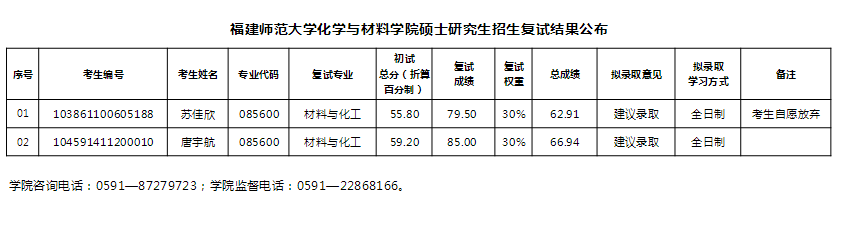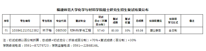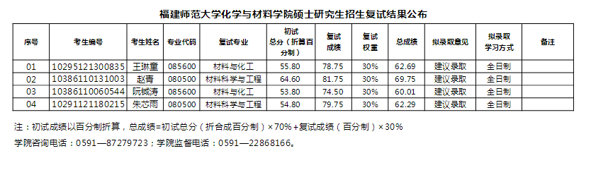 据悉,福建师范大学材料类硕士研究生复试结果公示(3.29)(3.30)(4.1)已公布,聚创福建师范大学考研网为大家整理如下: