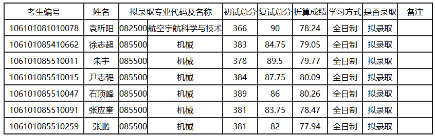 | 106101082510011 | 孟南宇 | 082500 | 航空宇航科学与技术 | 343 | 81.09 | 72.35 | 全日制 | 拟录取 | |