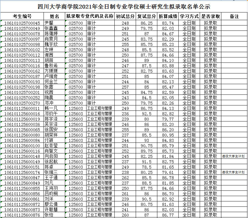 据悉,四川大学商学院2021年全日制专业学位硕士研究生拟录取名单公示已公布,聚创四川大学考研网小编为大家整理如下: