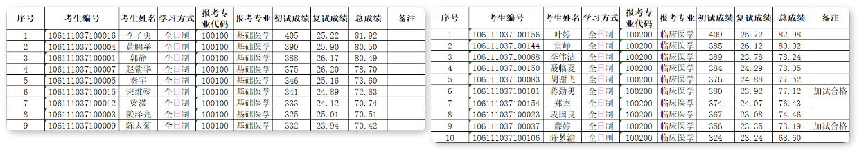 基础医学专业招生名额15名(其中已录取推免生3名),临床医学专业招生名额25名(其中已录取推免生3名),成绩公示如下: