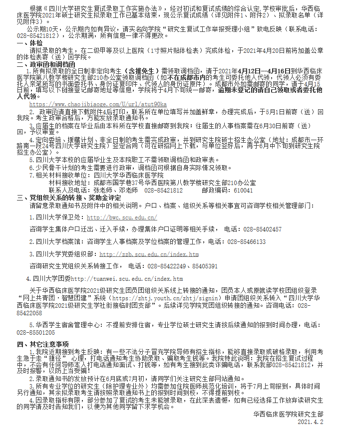 附件2:华西临床医学院2021年硕士研究生招生入学-调剂复试成绩公示