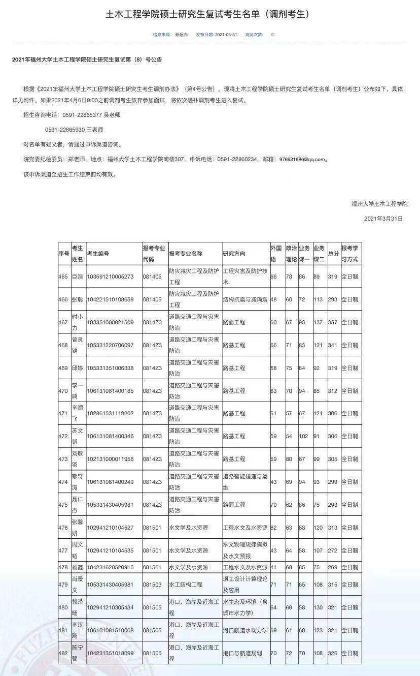 以上是聚创考研网为考生整理的"福州大学2021年土木工程学院硕士研究生复试考生名单(调剂考生)"的相关考研信息,希望对大家考研备考有所帮助!