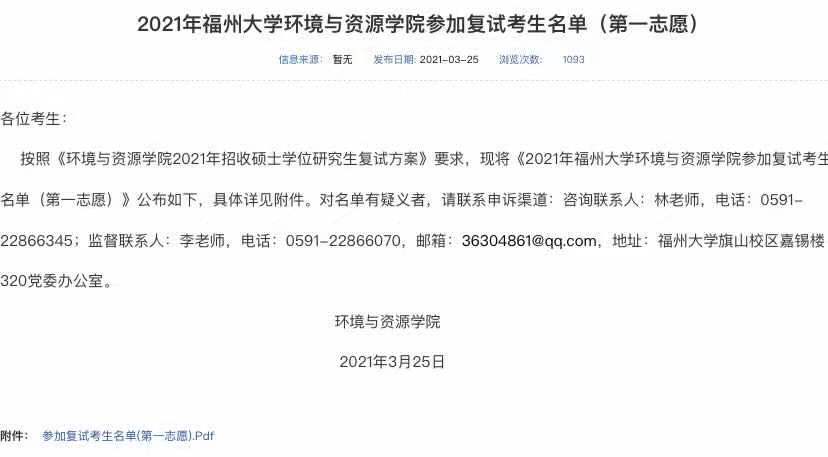 据悉,2021年福州大学环境与资源学院参加复试考生名单(第一志愿)已公布,聚创福州大学考研网汇总信息如下: