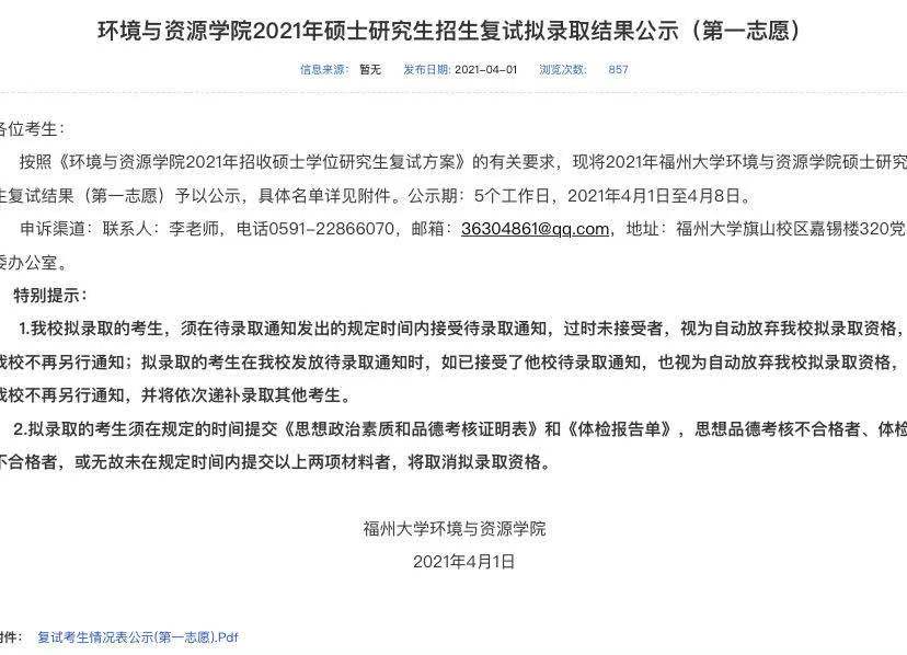 据悉,福州大学环境与资源学院2021年硕士研究生招生复试拟录取结果公示(第一志愿)已公布,聚创福州大学考研网汇总信息如下: