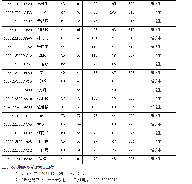 以上是聚创考研网为考生整理的"西南大学医学研究院关于2021年硕士研究生复试名单的公示(不含推免生)"的相关考研信息,希望对大家考研备考有所帮助!