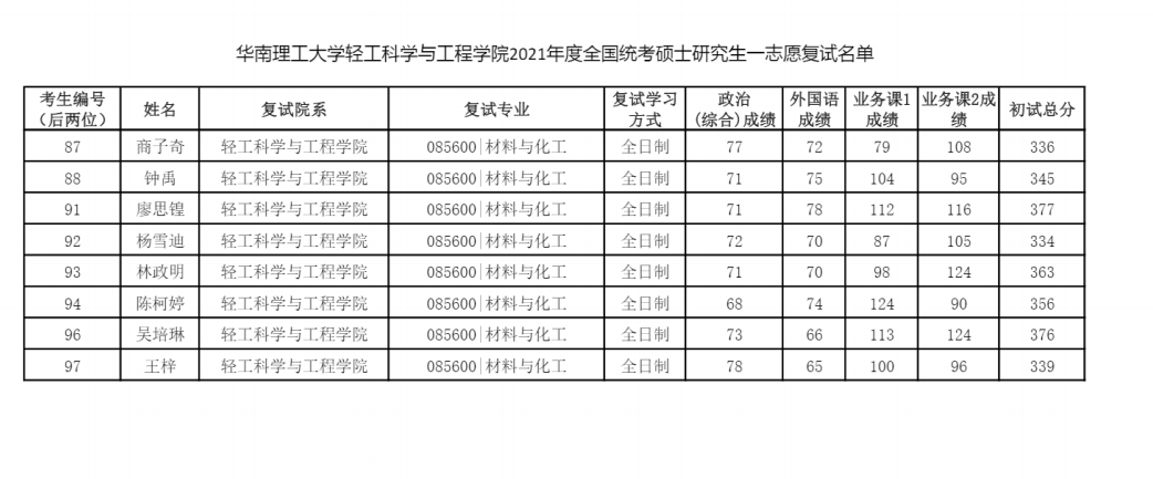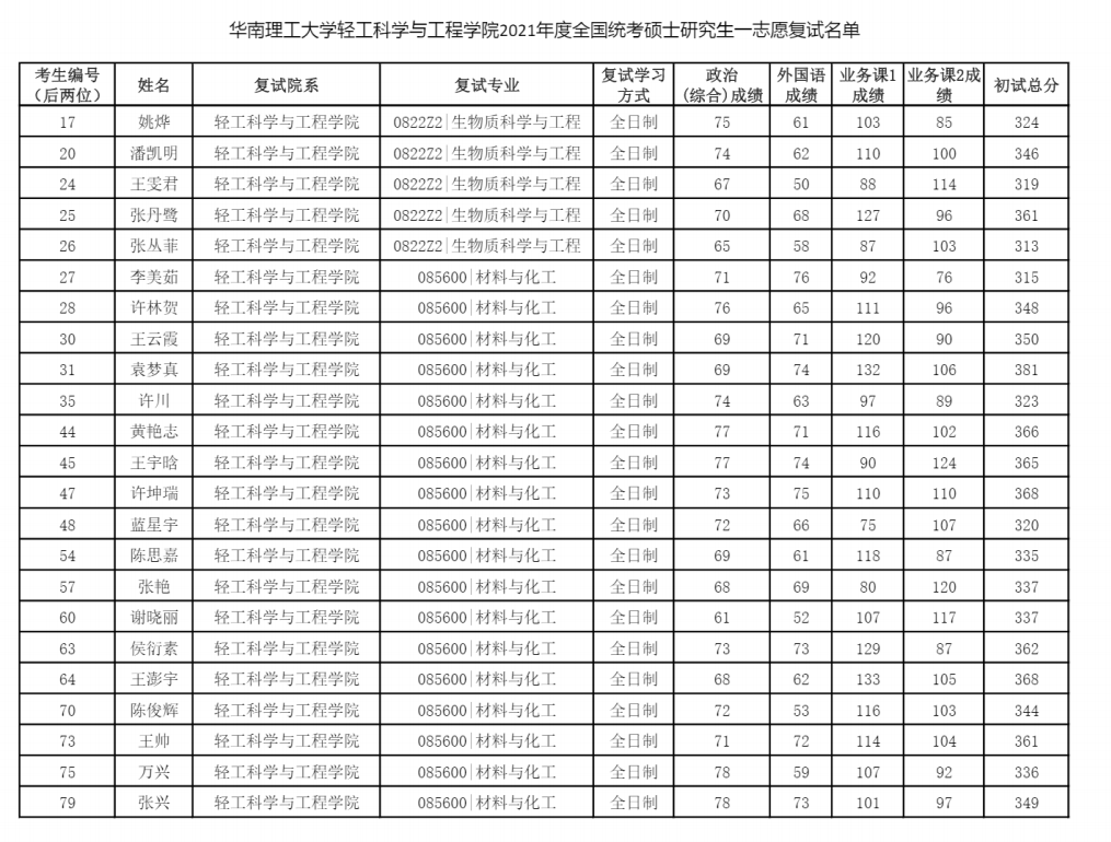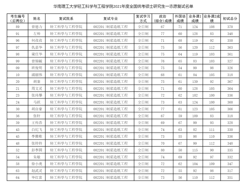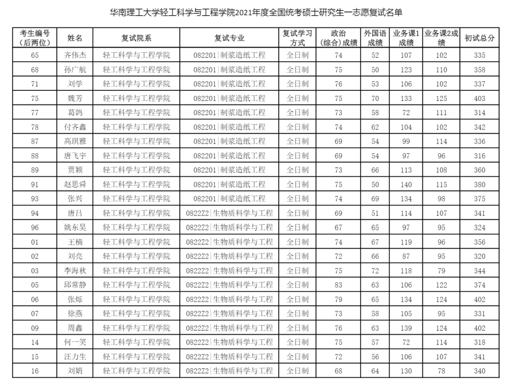 聚创华南理工大学考研网快讯,华南理工大学轻工科学与工程学院2021年度全国统考硕士研究生一志愿复试名单,详情如下:
