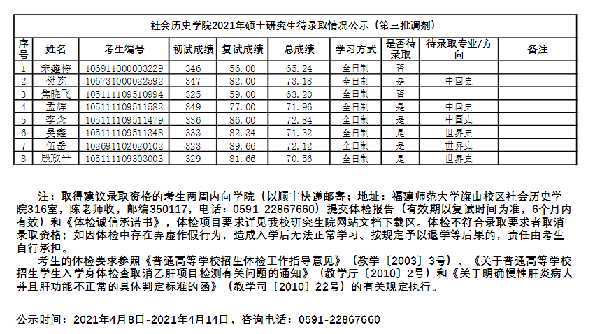 据悉,福建师范大学社会历史学院2021年硕士研究生待录取情况公示(第一批调剂)已公布,聚创福建师范大学考研网为大家整理如下: