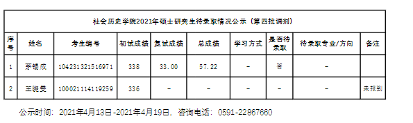 以上是聚创考研网为考生整理的"福建师范大学社会历史学院2021年硕士研究生待录取情况公示(第一~四批调剂)"的相关考研信息,希望对大家考研备考有所帮助! 备考过程中如有疑问,也可以添加老师微信juchuang911进行咨询。