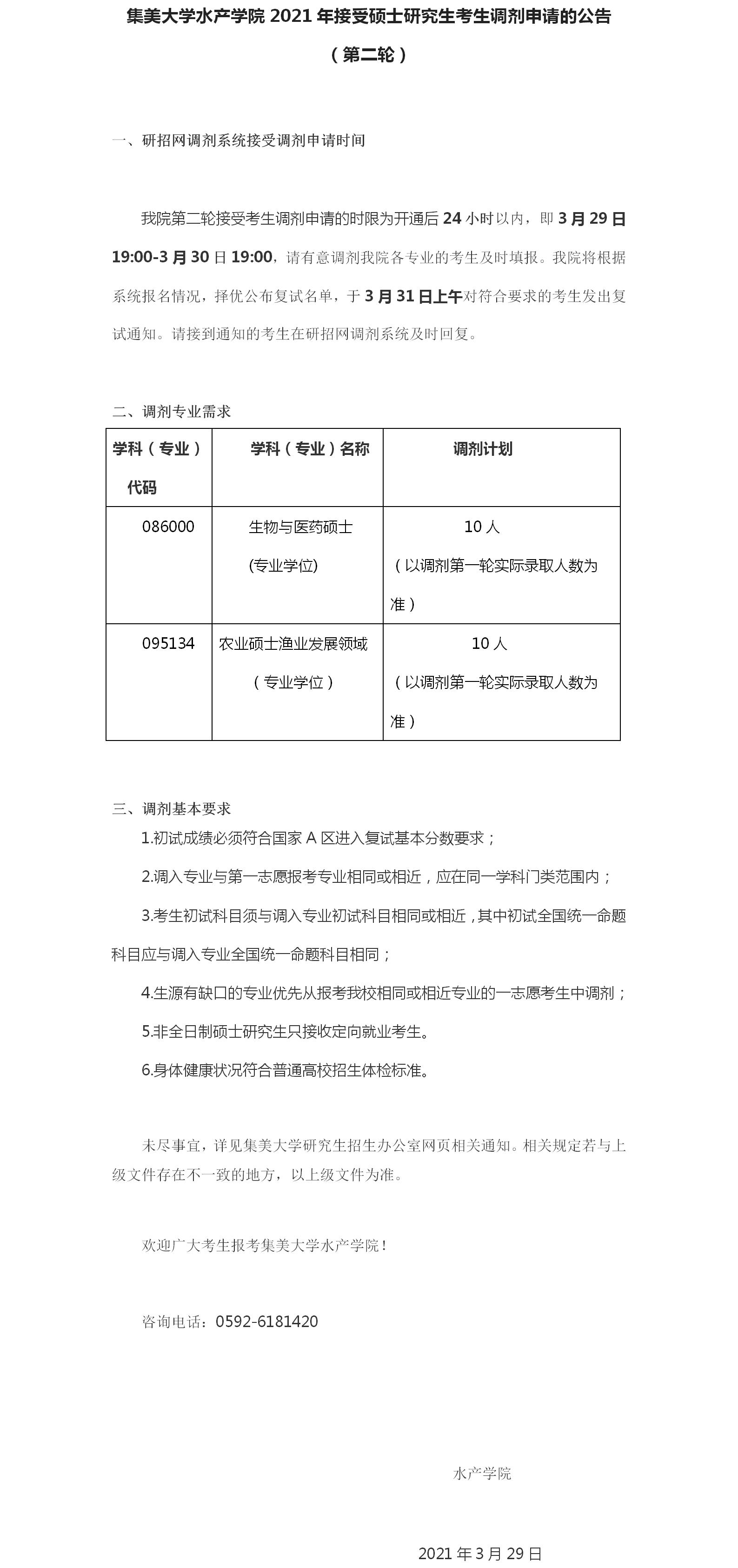 以上是聚创考研网为考生整理的"集美大学水产学院2021年接受硕士研究生考生调剂申请的公告(第二轮)"的相关考研信息,希望对大家考研备考有所帮助!