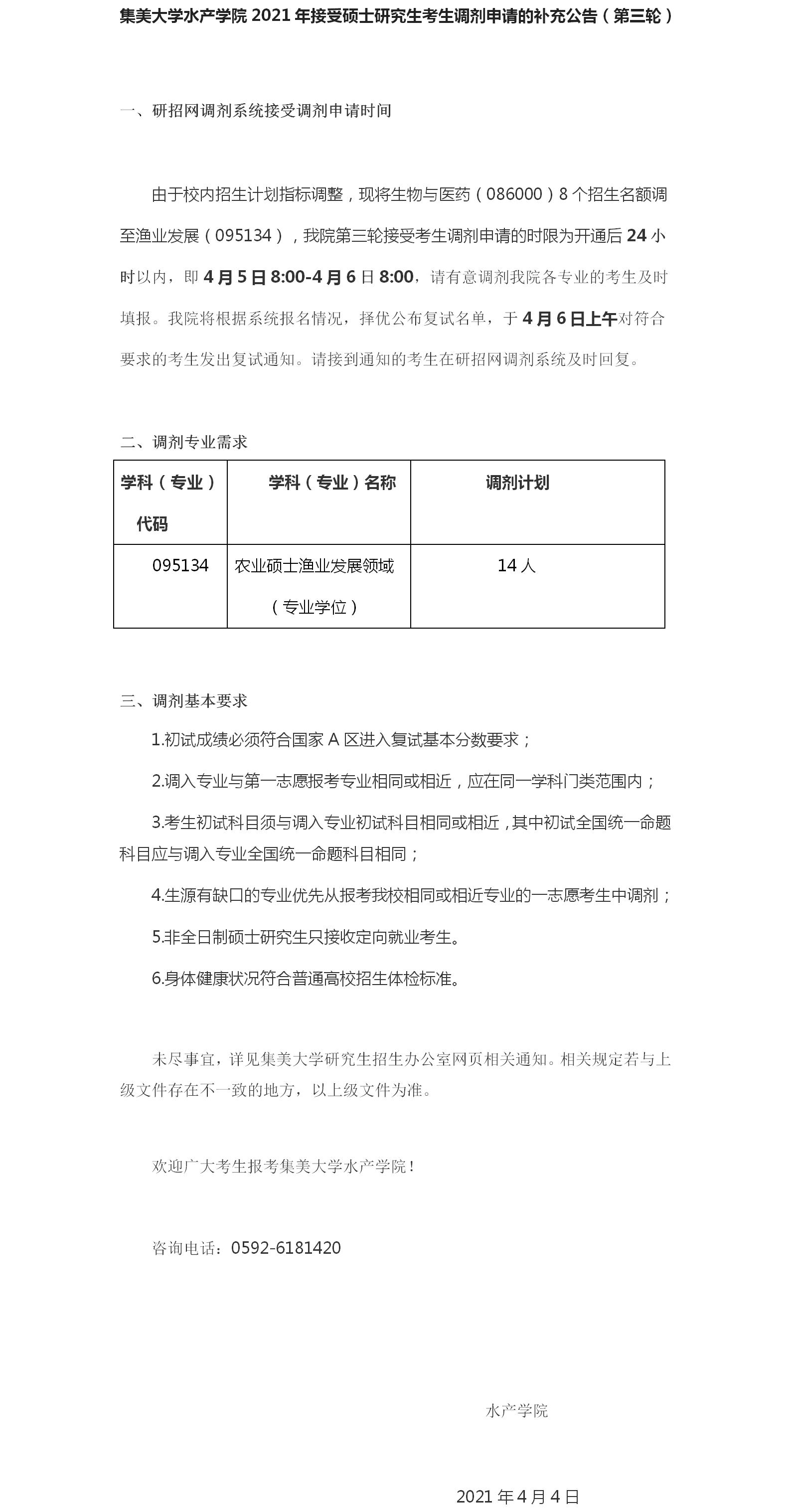 以上是聚创考研网为考生整理的"集美大学水产学院2021年接受硕士研究生考生调剂申请的补充公告 (第三轮)"的相关考研信息,希望对大家考研备考有所帮助!