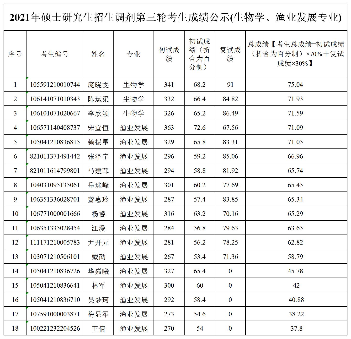 据悉,集美大学2021年硕士研究生招生调剂第三轮考生成绩公示(生物学、渔业发展专业)已公布,聚创集美大学考研小编为你整理如下内容: