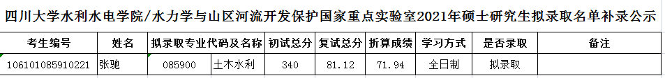 据悉,四川大学水利水电学院/水力学与山区河流开发保护国家重点实验室2021年硕士研究生拟录取名单补录公示已公布,聚创四川大学考研网小编为大家整理如下: