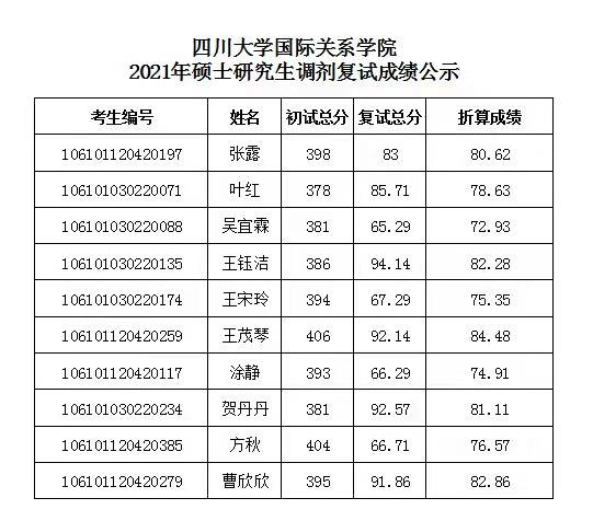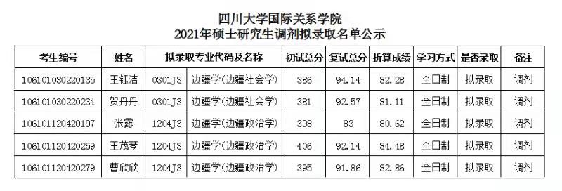 据悉,四川大学国际关系学院2021年边疆学硕士研究生调剂复试成绩公示及拟录取名单已公布,聚创四川大学考研网小编为大家整理如下: