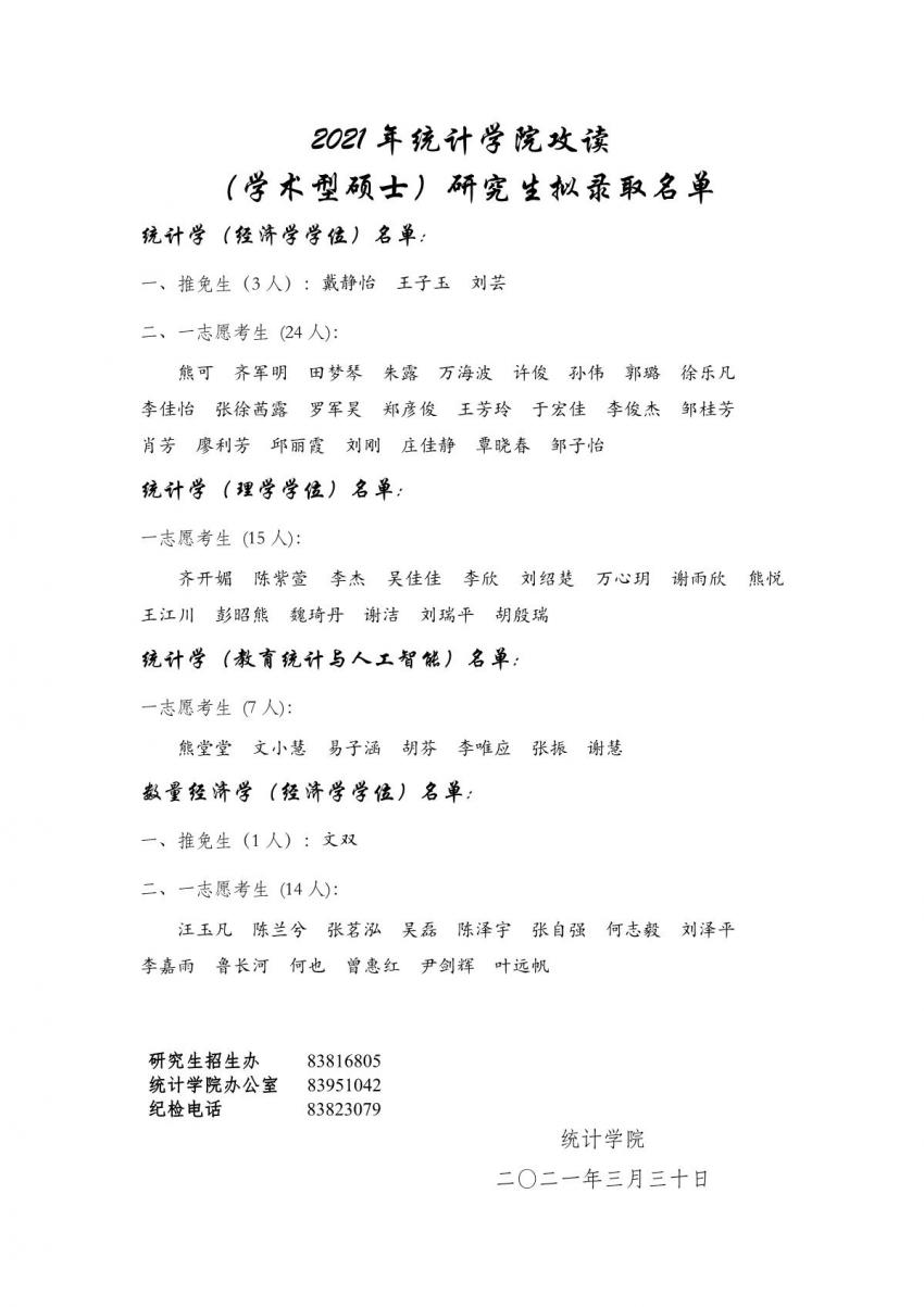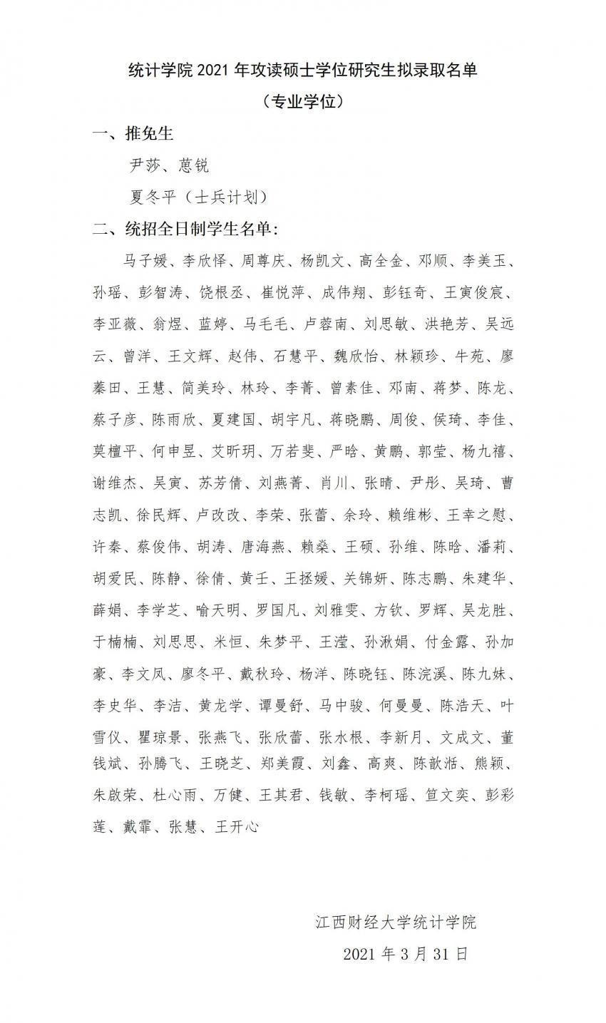 据悉,江西财经大学统计学院2021年硕士研究生拟录取名单公已公布,聚创考研网整理如下内容:
