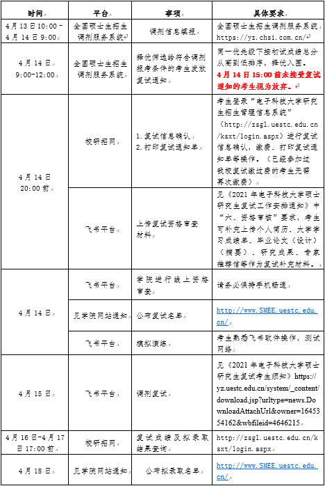 1. 复试准备、体检、拟录取等情况详见学院复试通知:https://www.smee.uestc.edu.cn/info/1108/15859.htm。
