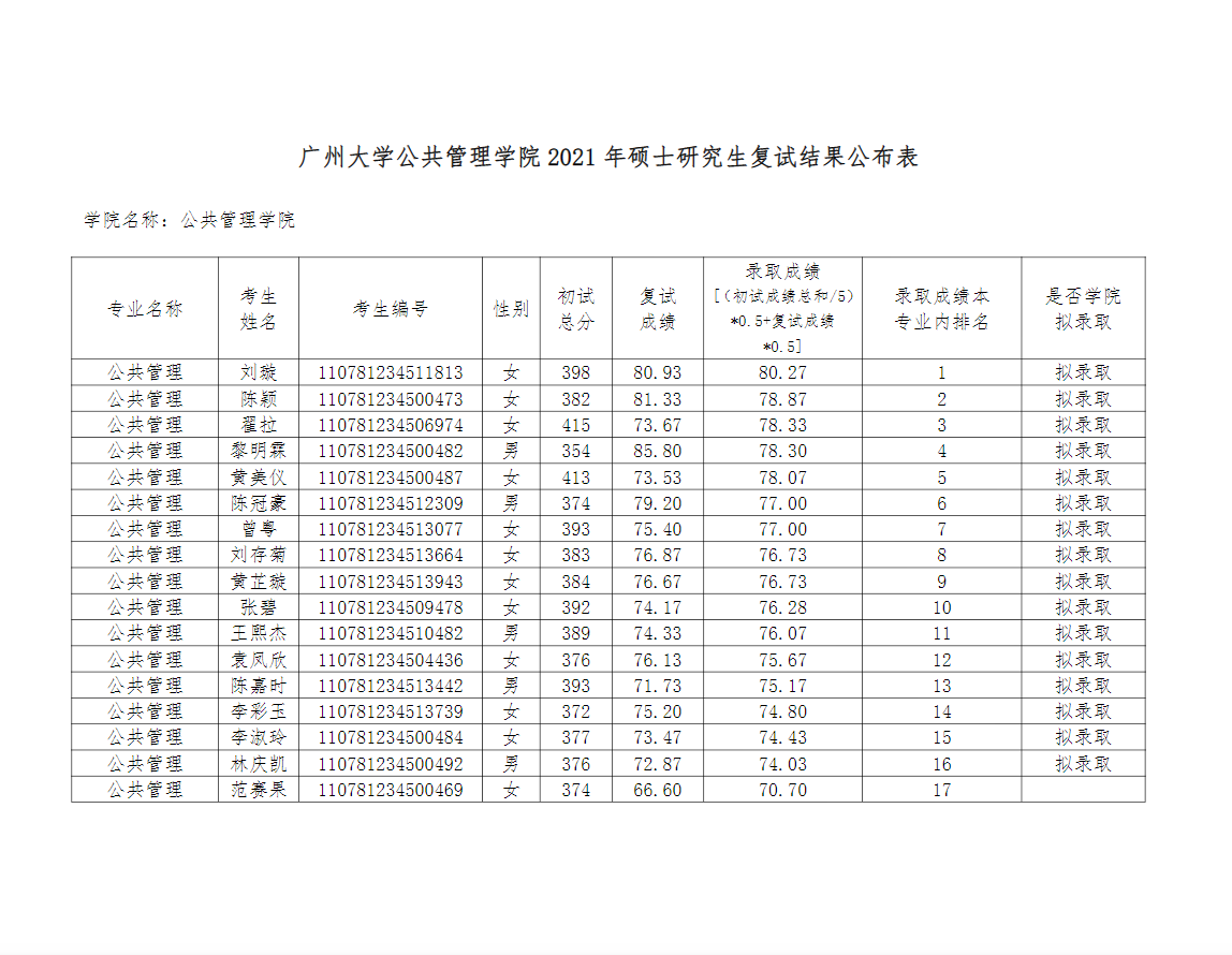 据悉,广州大学公共管理学院2021年硕士研究生复试结果已公布,聚创广州大学考研小编为大家整理内容如下: