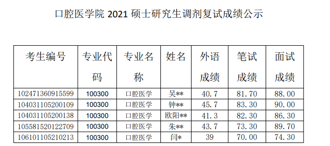 聚创南昌大学考研为大家整理了南昌大学口腔医学院2021硕士研究生调剂复试成绩公示:
