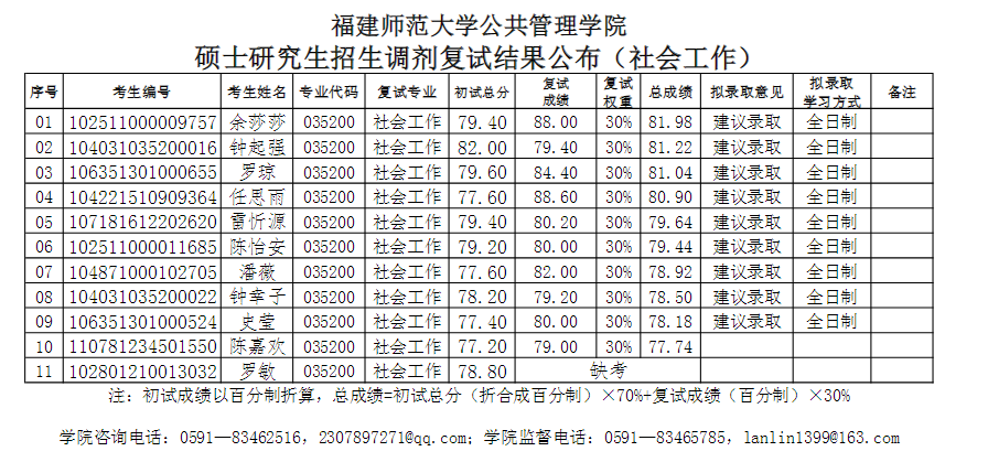据悉,福建师范大学硕士研究生招生复试调剂结果公布(社会工作)已公布,聚创福建师范大学考研网为大家整理如下: