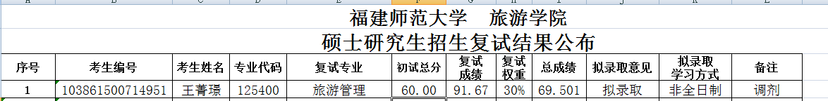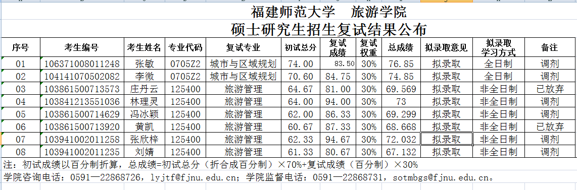 据悉,福建师范大学旅游学院第二、三批硕士研究生招生复试结果公布已公布,聚创福建师范大学考研网为大家整理如下: