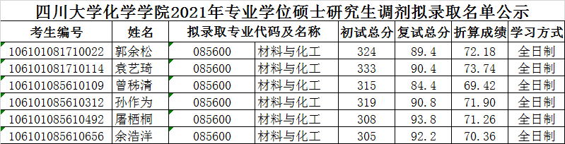 据悉,四川大学化学学院2021年专业学位硕士研究生调剂拟录取名单公示已公布,聚创四川大学考研网小编为大家整理如下: