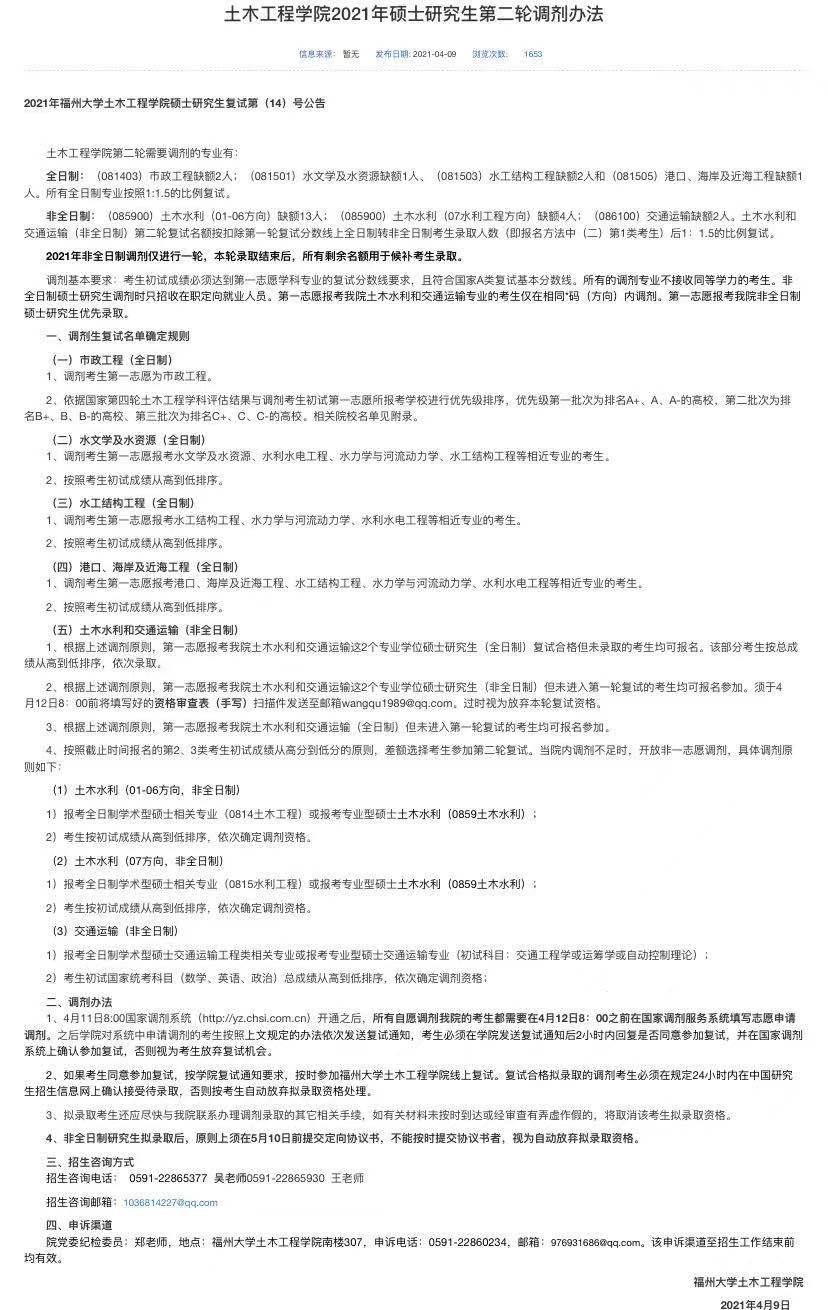 据悉,福州大学土木工程学院2021年硕士研究生第二轮调剂办法已公布,聚创福州大学考研网汇总信息如下: