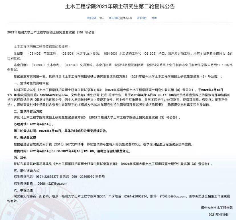 据悉,福州大学土木工程学院2021年硕士研究生第二轮复试公告已公布,聚创福州大学考研网汇总信息如下: