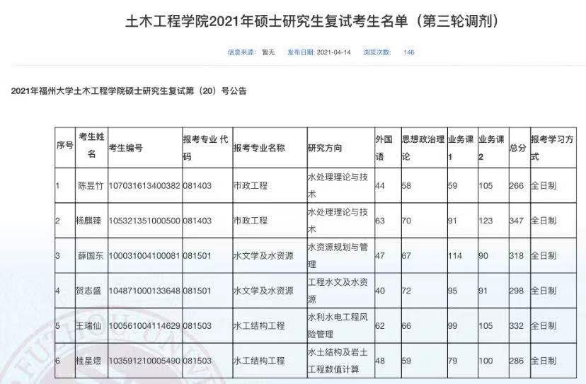 据悉,福州大学土木工程学院2021年硕士研究生复试考生名单(第三轮调剂)已公布,聚创福州大学考研网汇总信息如下: